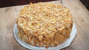- Belinda Rum Cake- a moist white cake, brushed with rum syrup and finished with cream-cheese icing and sliced toasted almonds